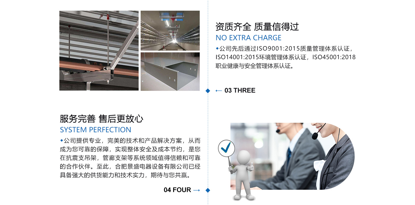 合肥景盛電器設備有限公司創建于2011年,注冊資本3000萬,總公司位于中國重要的科研基地,制造業基地,長三角城市群中心城市-----合肥市,地理位置好,交通方便。本公司2017年從事抗震支吊架,電纜橋架,機電產品生產研發,支吊架方案設計,BIM管線綜合優化設計及配套服務與一體的技術解決方案供應。公司在產品系統設計,研發,生產,運營,銷售,工程安裝及售后維護配備了行業內經驗豐富,服務程度高的隊伍,目前有研發設計工程師20多人,工程師6人,員工共計150多人。并擁有施工安裝團隊,有非常廣闊的市場和客戶源,我們的團隊具有很強的創作性,協作性及豐厚的人才儲備。 公司先后通過ISO9001:2015質量管理體系認證...
